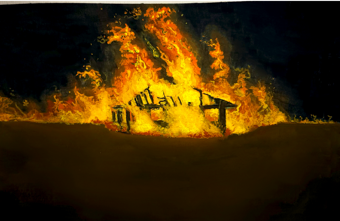The view solidifies the knot in his stomach. A dull glow stains the distance, pulsing, like hell itself was coming to life. As his body grows tense, ash begins to drift past the glass, floating like snow that forgot how to be cold. Logan breaks away from a heat-fueled haze, turning his attention to the hallway. “Levi!” His voice cracks under the fear choking him. The house makesa low, aching sound as it adjusts to the rising heat. He makes for the bedroom, already movingfaster than his legs want to carry him, his feet striking the ground with violence. His own voice echoed in his head.