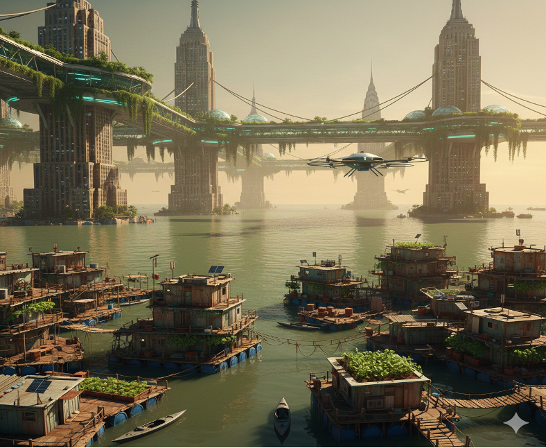 Behind him, the "Silt" shantytowns bobbed on the murky waters of what used to be 42nd Street. These were homes built of necessity: blue plastic chemical drums, scavenged plywood, and rusted corrugated tin, all lashed together with climbing rope. They looked like barnacles clinging to the hulls of the great glass whales—the skyscrapers of Manhattan.