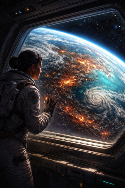 Below her, continents looked scorched. The Amazon — once a dense emerald lung — was now a rust-colored smear. The Sahara had marched south and east, swallowing nations. Australia’s interior glowed like a kiln. Fires traced bright scars across the night side of the planet.